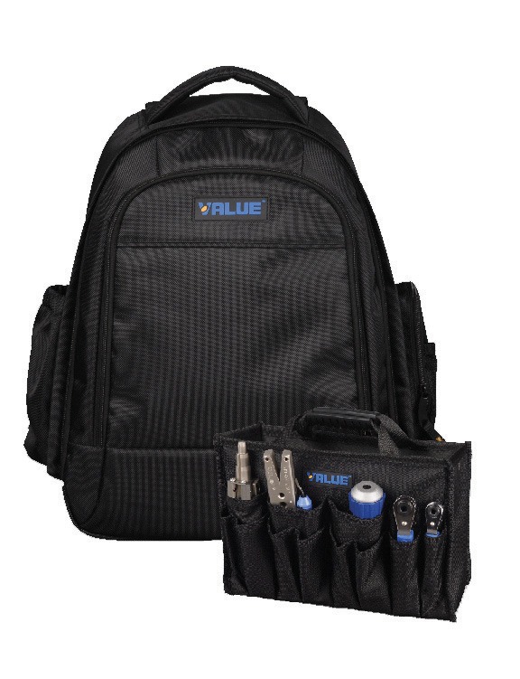 Large carrier bag featuring a flaring tool, tube cutter, manifold gauge, digital clamp meter, tube expander, deburring tool and a ratchet spanner.