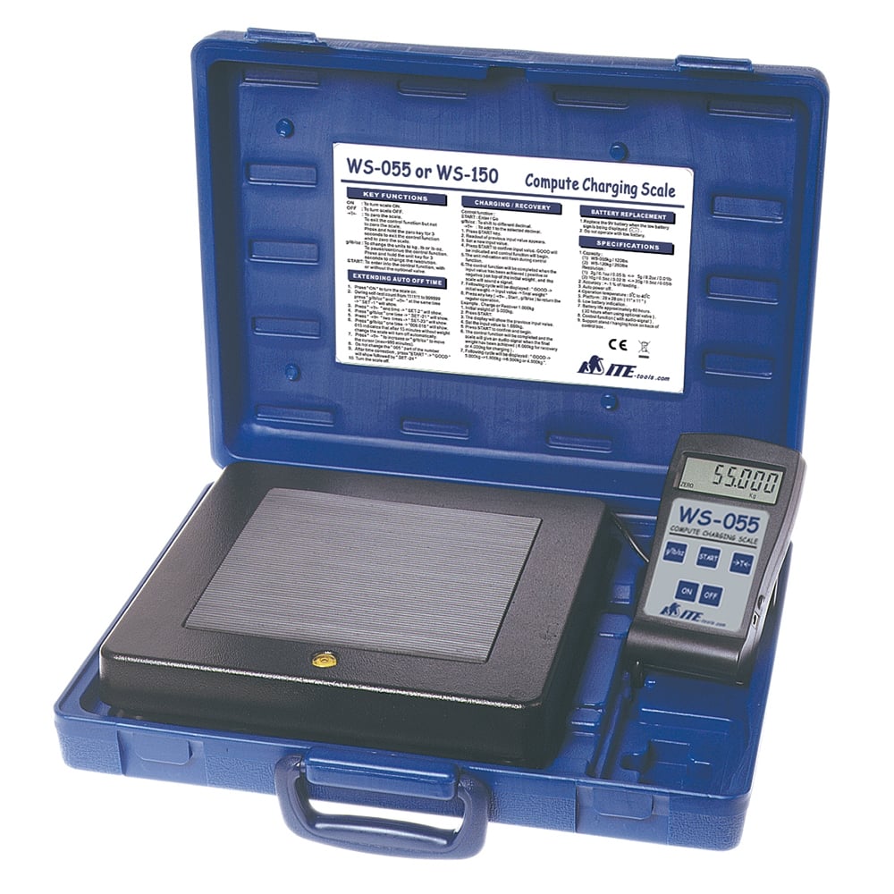 Weighing and recovery scale Product features: Designed for both charging and recovery. Can be used with all refrigerants and hydrocarbons. 55 kg (120 lb) max capacity.