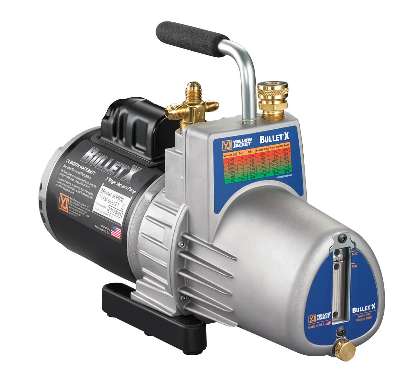 Wide mouth oil reservoir port for easier, cleaner filling. The YELLOW JACKET BULLET X vacuum pump is a two-stage rotary vane oil-sealed 7 CFM pump that pulls down to 25 microns or better.