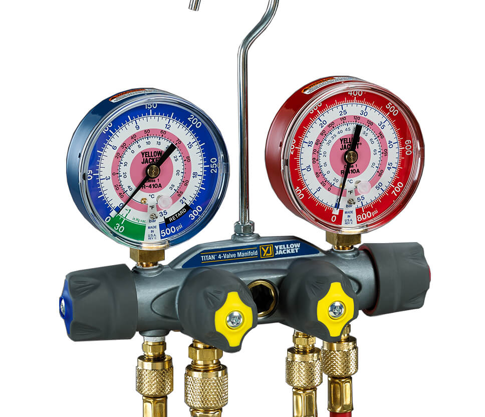YJ Titan 4 Valve test and charging manifold Forged aluminum alloy body makes this unit lightweight for handling ease with the durability and reliability required for repeated use.